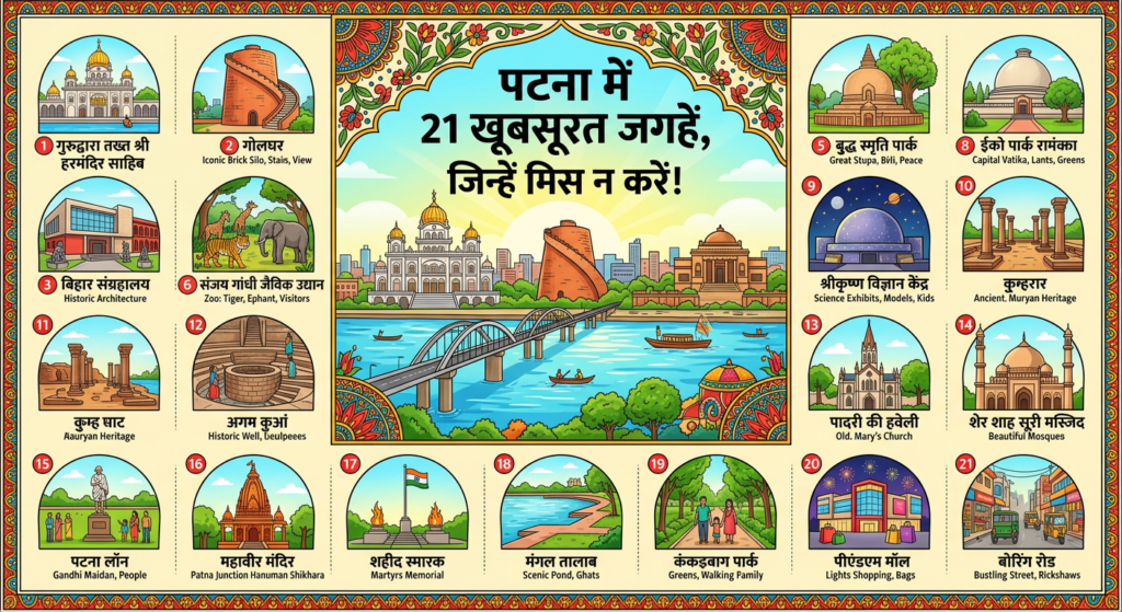 पटना में घूमने लायक 21 खूबसूरत जगहें, जिन्हें मिस न करें, क्या आप एक ही दिन में मंदिर, संग्रहालय, गंगा घाट और हरियाली सब देखना चाहते हैं? पटना में ये बिल्कुल संभव है, खासकर मार्च 2026 जैसे सुहाने मौसम में, जब दिन हल्के गर्म और शामें आरामदायक रहती हैं। नीचे 21 जगहें संक्षेप में हैं, इसलिए प्लान बनाना आसान होगा। परिवार, कपल, इतिहास प्रेमी, और बच्चों के साथ यात्रा करने वाले, सभी को यहां अपना-अपना मज़ा मिलेगा।